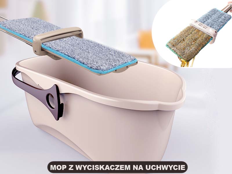 Mop wyposażony jest w dwukomorowe wiadro z wyciskaczem. Innowacyjny system dwóch zbiorników pozwala na ciągłą pracę bez konieczności wymiany wody – pierwszy służy do płukania, drugi natomiast do wyciskania nakładek. Nawet jeśli sprzątanie, nie należy do Twoich ulubionych zajęć, z pewnością błyskawicznie polubisz ten innowacyjny sprzęt czyszczący.